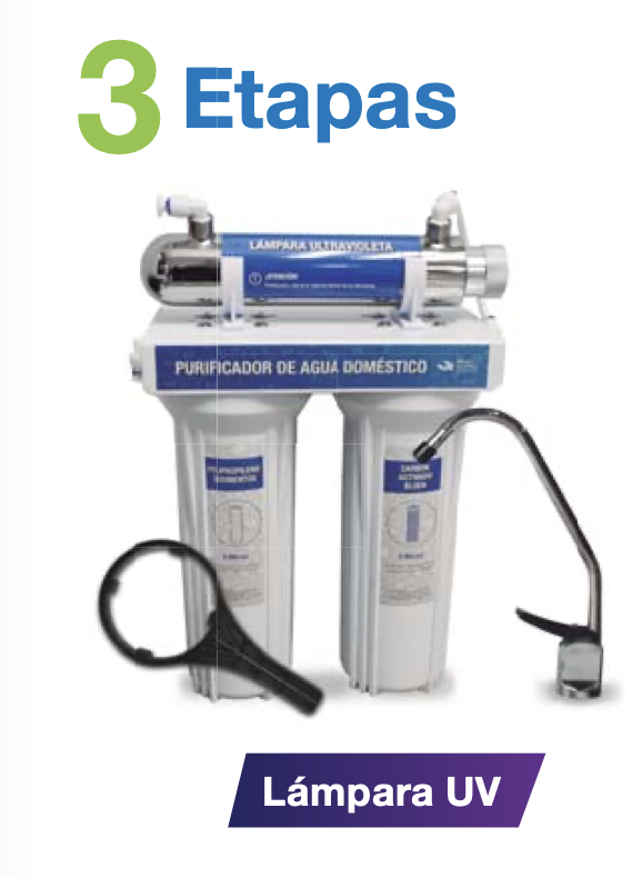 Éste equipo le brinda la seguridad de estar consumiendo agua purificada, ya que cuenta con un sistema de prefiltración como es cartucho de sedimentos, carbón block y agrega una lámpara UV, que le asegura la desinfección microbiólogica del agua.