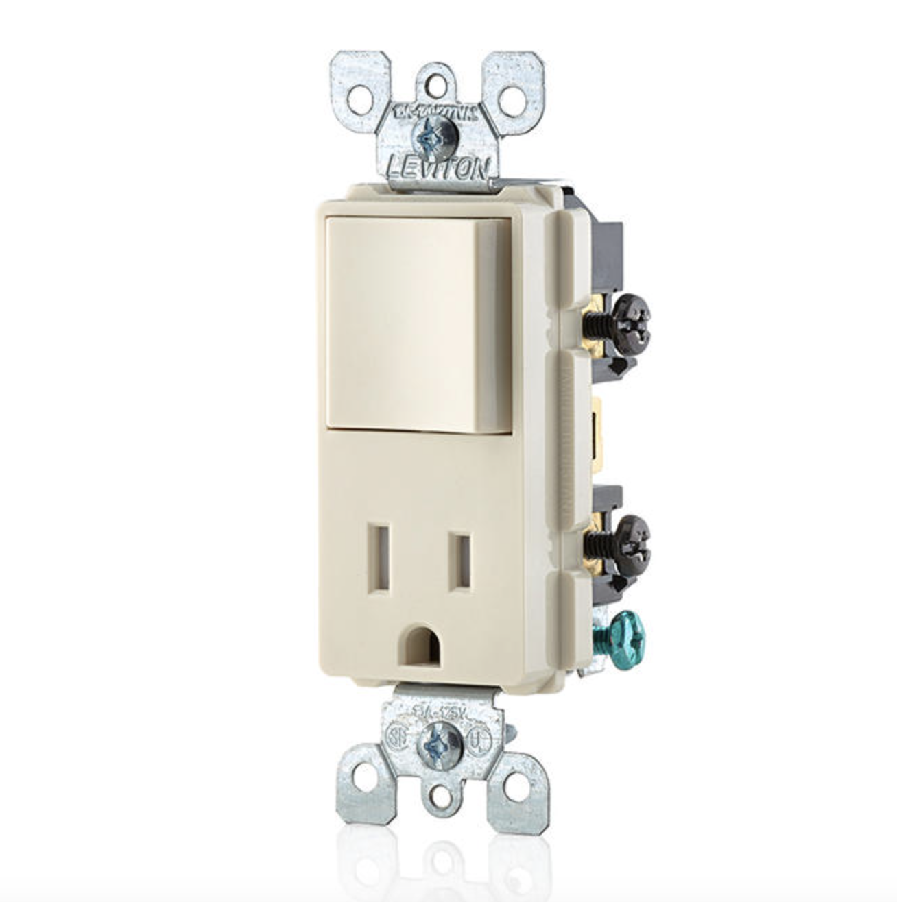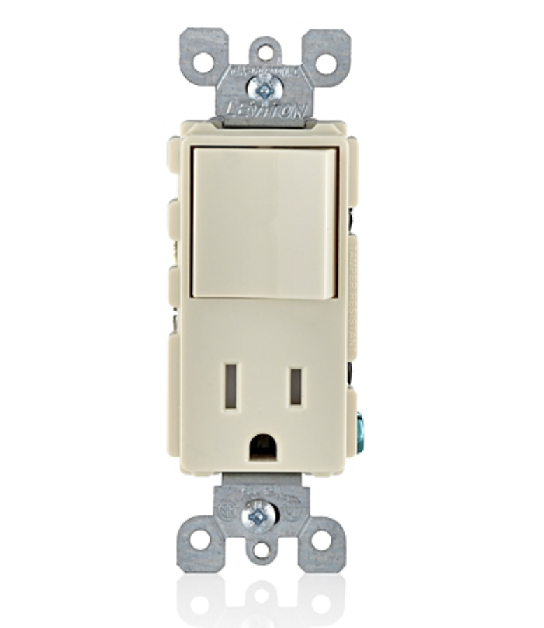 15 A, 120 V, Interruptor de combinación de CA 5-15R Decora, uso comercial, Conexión a tierra, dos 2-Polos, 3-cables, Cableado lateral – Almendra claro