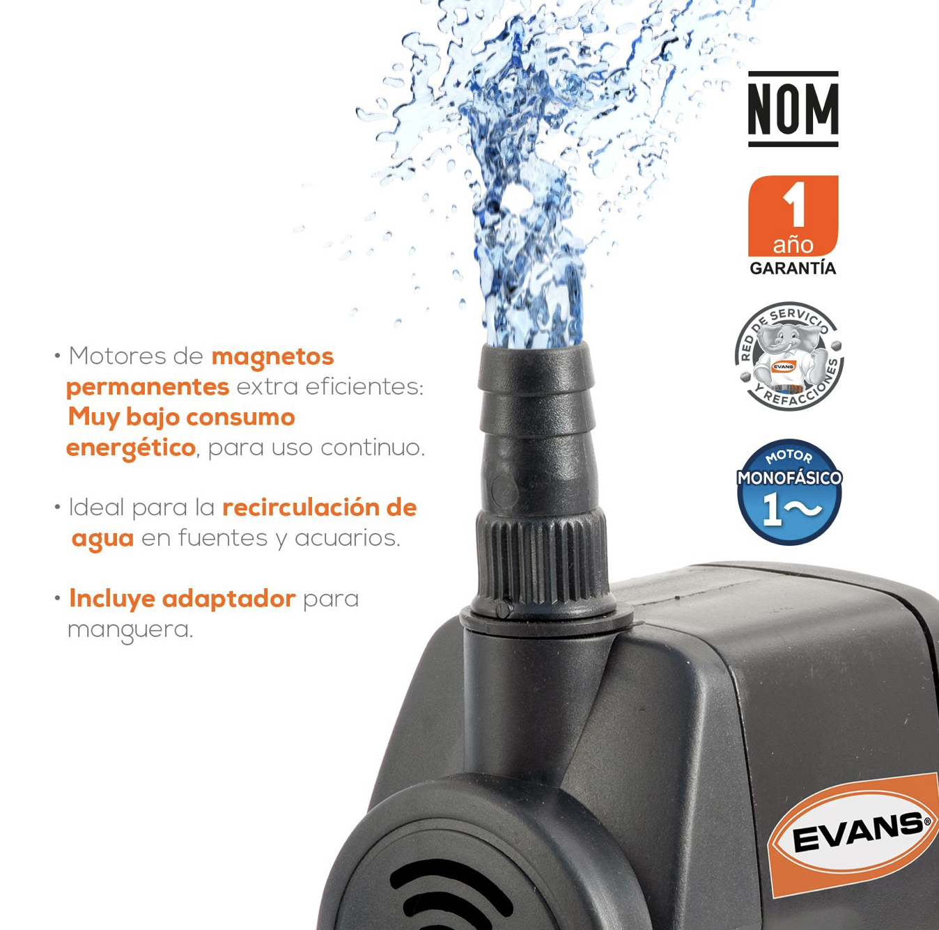 La bomba para fuentes de ornato y estanques de 16W de EVANS, modelo AQUA18W, es una excelente elección para quienes buscan mejorar la recirculación de agua en fuentes, acuarios y peceras. Este equipo compacto y duradero no solo garantiza un flujo constante de agua, sino que también contribuye a la oxigenación, favoreciendo la salud de tus peces y plantas. Su diseño incluye un adaptador para mangueras, facilitando una instalación rápida y sencilla.