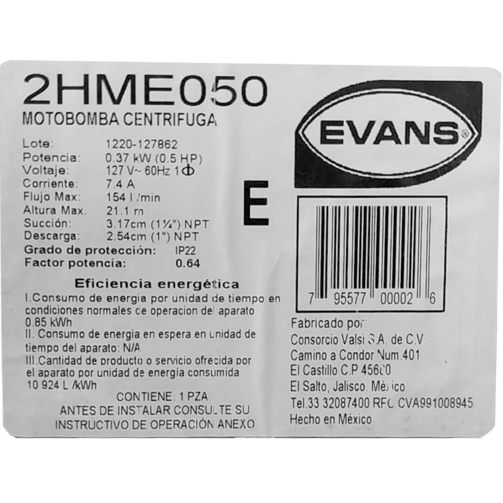 BOMBA CENTRIFUGA ELEVACIÓN EVANS 1 HP