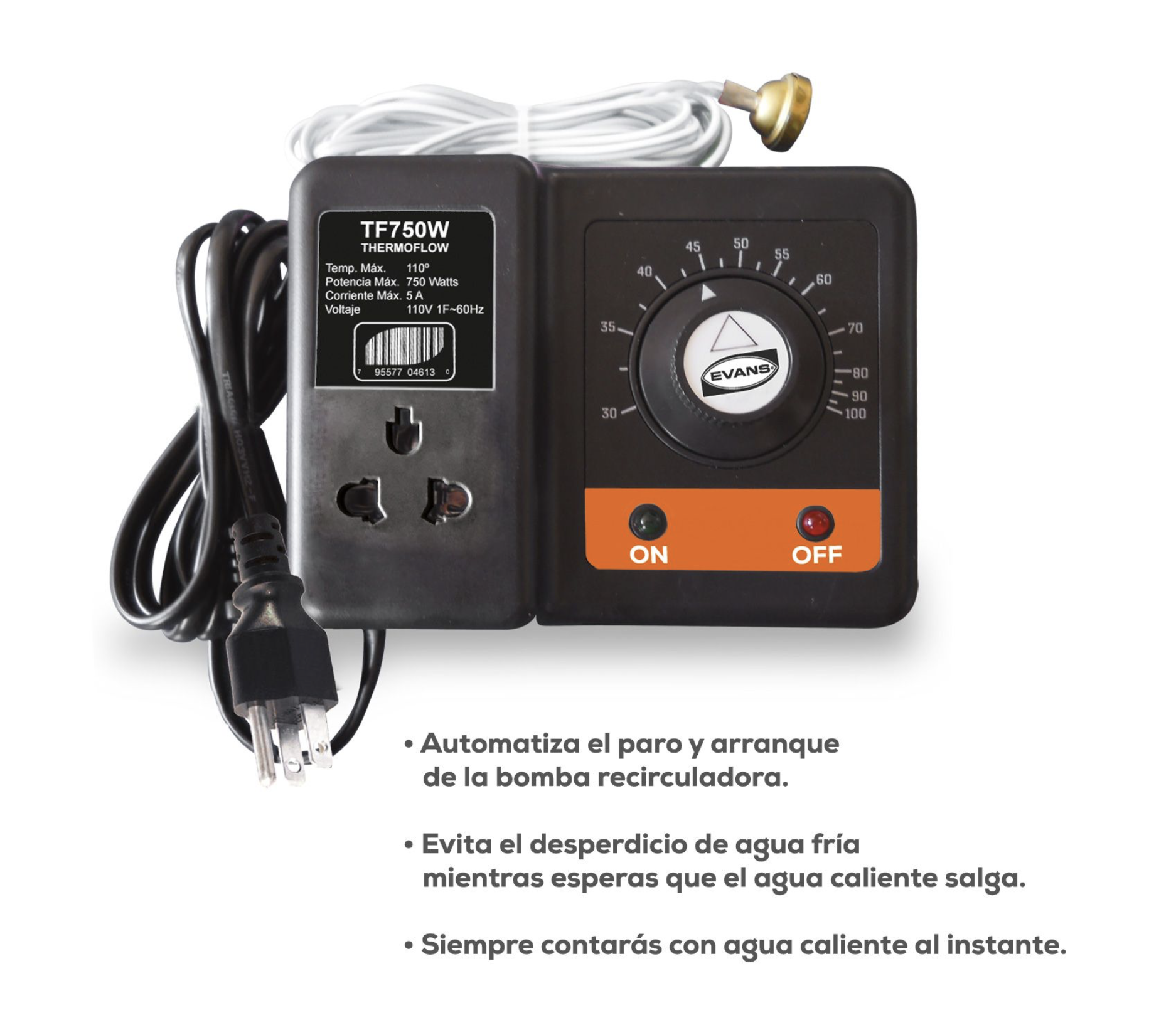 El Termostato TF750W incluido con la recirculadora EVANS BRAC-DUO es un componente clave que añade un nivel de control sin precedentes a tu sistema de agua caliente. Este termostato automatizador controla el arranque y paro de la bomba, asegurando que el agua caliente esté disponible justo cuando la necesitas, sin desperdiciar energía ni recursos.