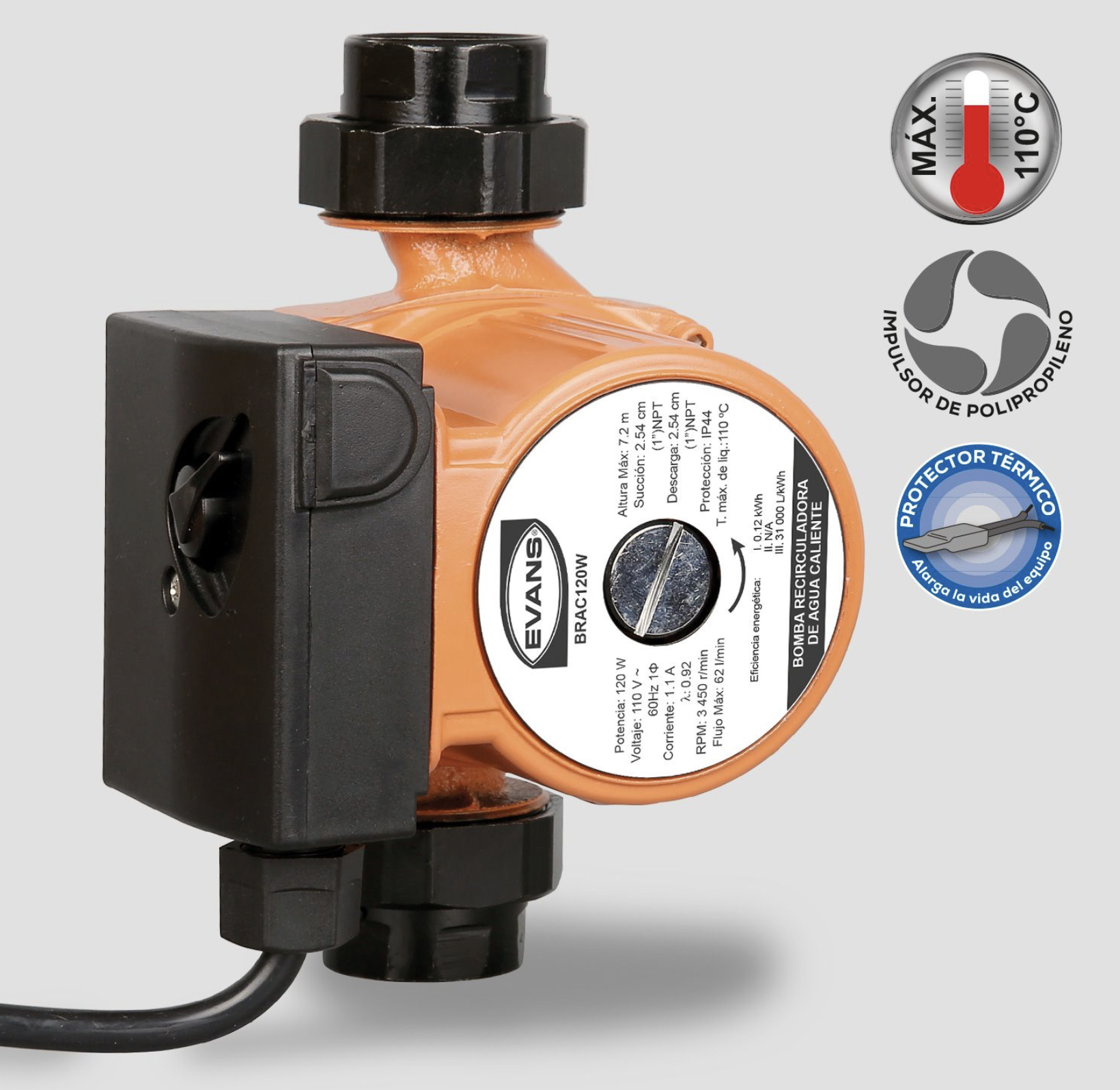 Características Especiales: Bomba silenciosa con uniones en acero y termostato de arranque y paro automático. Ideal para recircular agua caliente en todo tipo de calentadores, garantizando agua caliente disponible siempre y sin desperdiciar.