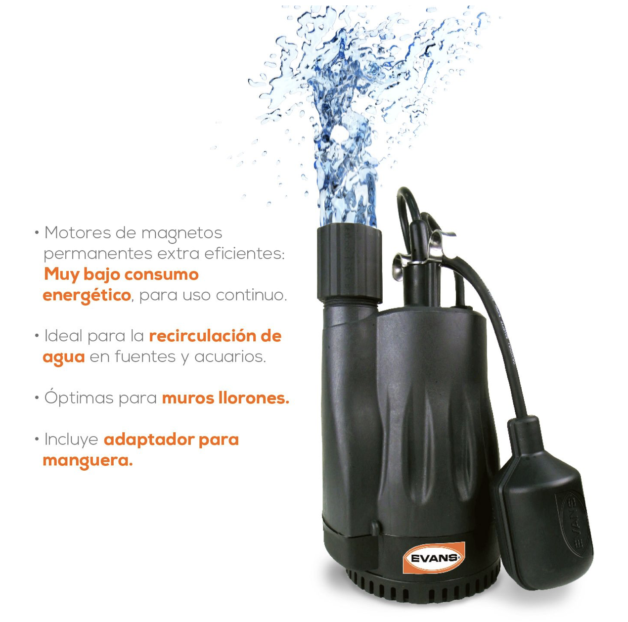La bomba sumergible AQUA200W-F de Evans es una solución avanzada para el bombeo en fuentes y sistemas de ornato. Con una potencia de 0.25 HP y un flujo óptimo de 65 LPM, esta bomba está diseñada para ofrecer un rendimiento superior en instalaciones de fuentes. Ideal para quienes buscan eficiencia energética y un funcionamiento silencioso.