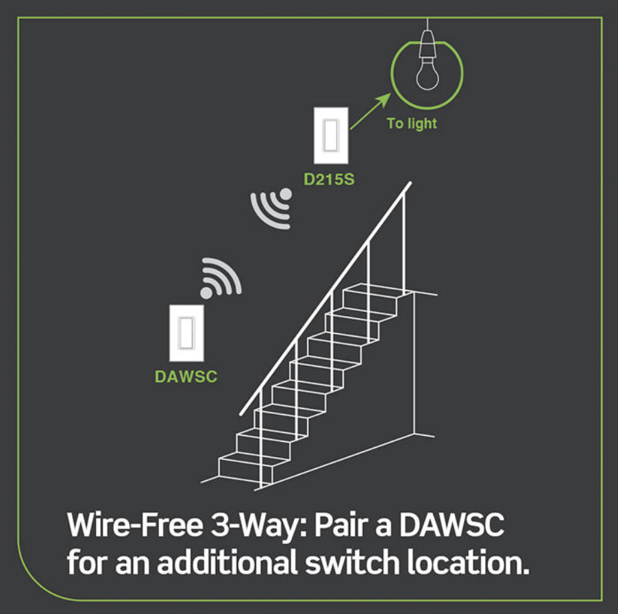 El Decora Smart® Anywhere Switch Companion DAWSC-1BW se empareja de forma inalámbrica con cualquier dispositivo Decora Smart Wi-Fi® de segunda generación, incluidos D26HD, D215S, D2MSD, D2SCS, D24SF, D23LP, D215P, D215R o DN6HD/DN15S a través de MLWSB, para proporcionar ubicaciones de control de iluminación de encendido/apagado adicionales donde más lo necesite, como en la base de una escalera, al final de un pasillo o áreas abiertas con múltiples entradas, como una cocina grande o una sala familiar.